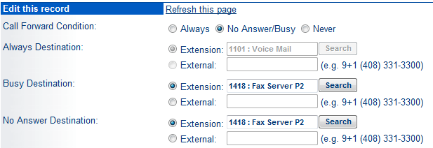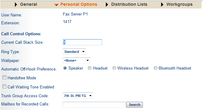 Click Personal Options for Fax Server 1 and give it a call stack size of one. Then set the Standard call handling mode up for “Busy/No Answer” and set the destination to “Fax Server 2”. Repeat this for each extension in the chain. Fax Server 2 will forward to Fax Server 3 when busy and so forth. When you get to the last one in the chain, set it to go to Fax Server 1.