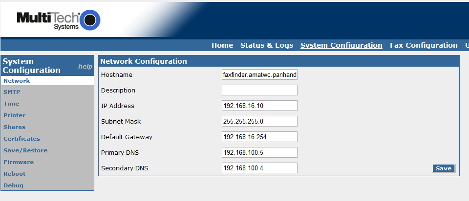 Click the save button and then go setup your SMTP server in the next section, and make sure the Timezone setting is correct under time. It will probably reboot. You can now hook the fax server up into your network and access it from the IP address you just put in.