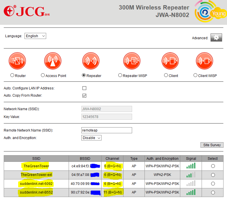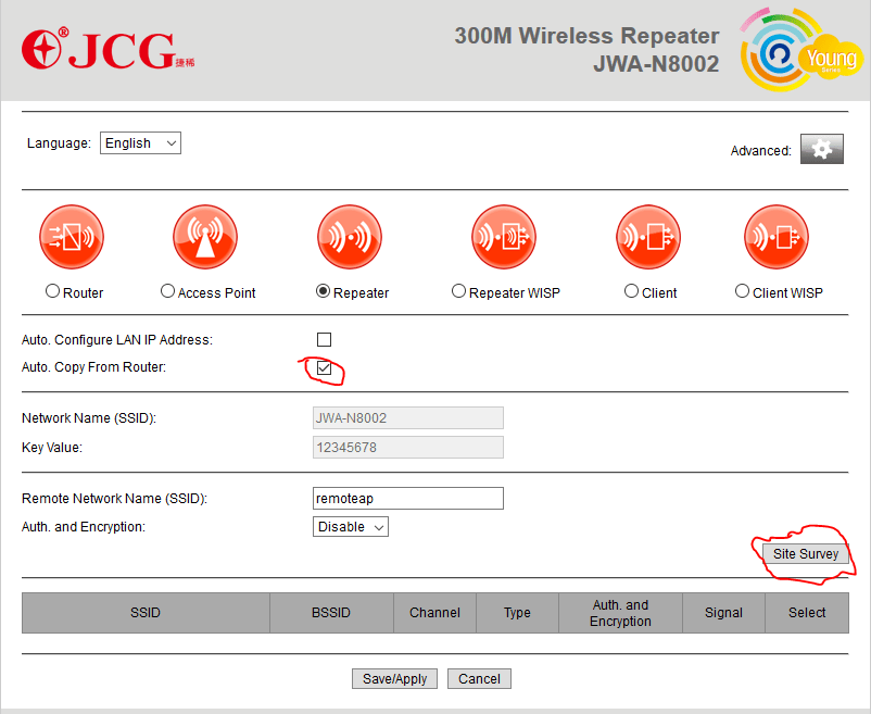 Step 5: The basic set up wizard should already be set to “Repeater”. If it isn’t select it. Leave the “Auto Copy From Router” checked. Mine did not have the “Auto. Configure Lan IP Address” checked. I think if you don’t have a DHCP Server on your router you might need to check that. Next, click the “Site Survey Button”. Don’t change anything else on this screen.